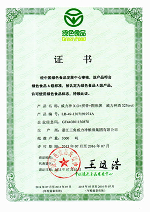 2013年7月,经中国绿色食品发展中心审核,威力神牌威力神酒,威力神XO酒符合绿色食品标准,被认定为绿色食品A级产品,许可使用绿色食品标志。
