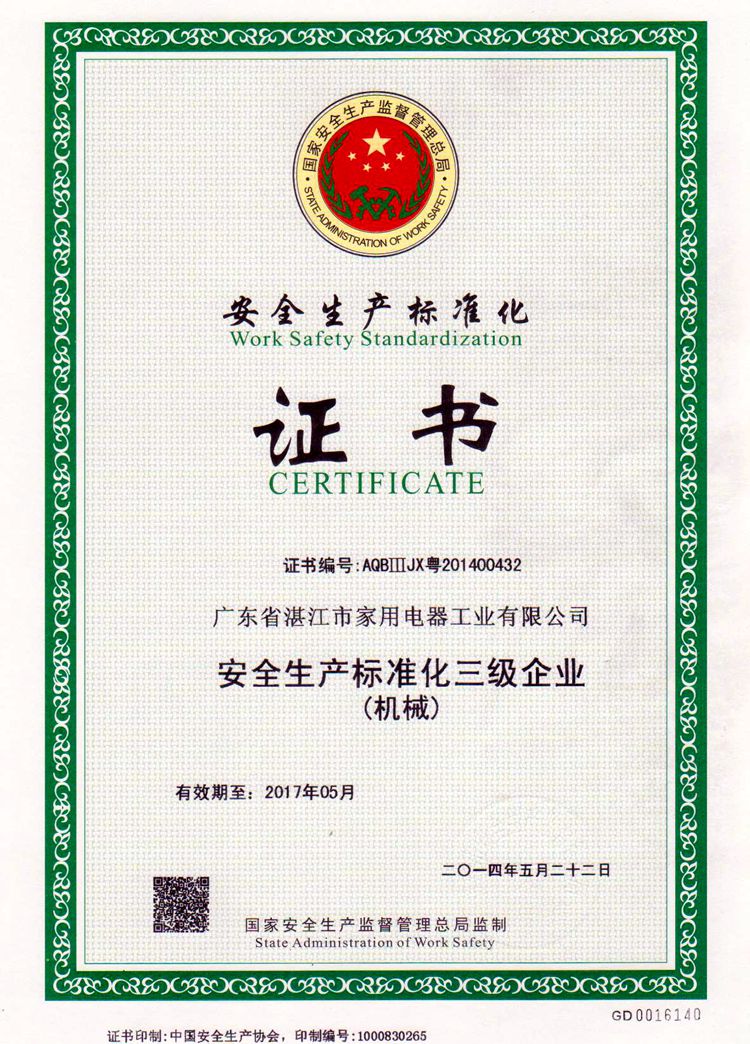 近日,经湛江市安全生产监督管理局综合评审,我集团公司家用电器工业园顺利通过了安全生产标准化三级企业审核,被授予“安全生产标准化三级企业”称号,并颁发了证书和铭牌。