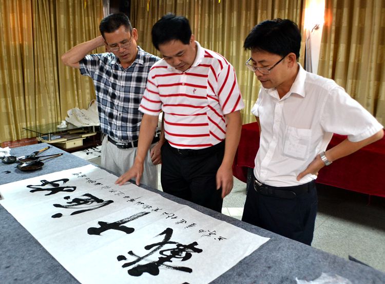 叶总与陈会长(左一)坡头区李区长(右一)一起品评书法
