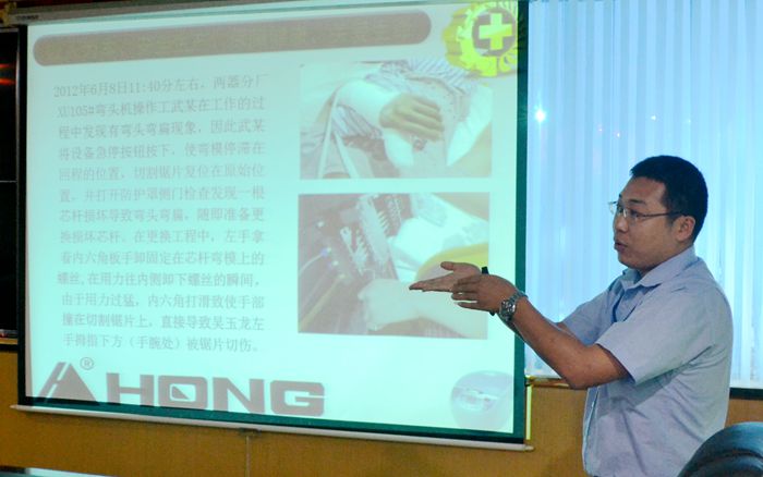 梁总在会议传达了安全生产工作会议精神,着重传达了安全事故预防与管理; 安全方针:不伤害自己,不伤害别人,不被他人伤害,围绕事故的特性:因果性、偶然性、必然性、规律性、潜在性、再现性、预测性,事故的潜在原因;《企业职工伤亡事故分类标准》,生产现场的控制重点;安全教育对策。还用事故案例为活生生发生在我们身边的致伤、致残的工伤事件,血淋淋的事故场面希望引起在场的每一个管理人员重视。