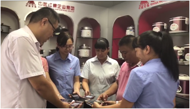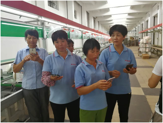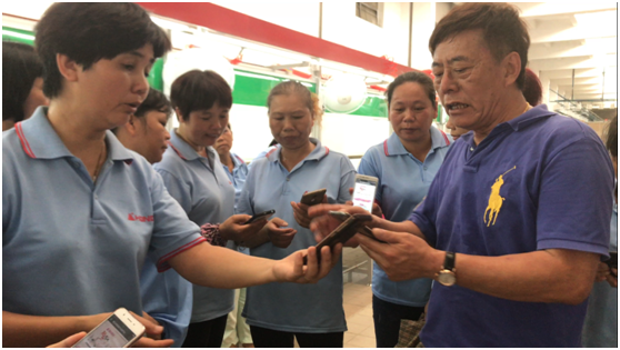 黄国明副总在车间为大家讲解投票方式,我司员工纷纷拿出手机参与投票。