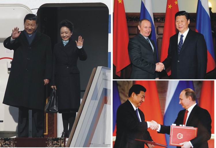 一天半时间的访问,被俄总统普京称作“一次具有历史意义的访问”。在两国元首会晤中,双方就加强中俄全方位战略合作达成重要共识。习近平系统阐释了深化中俄全面战略协作伙伴关系在两国外交全局和对外关系中占据的优先战略地位;双方就务实合作进行了深入探讨、见证了两国企业一系列务实合作协议的签订。双方确立了积极开展战略性大项目合作的新思路,务实合作内容涵盖能源、贸易、地方合作、国际关系等等。中俄两国此次签署了30多项涉及政治、经济、人文、高科技等领域的合作协议。习主席与普京总统一起同两国5000多名观众出席了俄罗斯“中国国家旅游年”的开幕式。习主席向近千名俄罗斯大学生发表演讲,并现场互动地回答了俄方青年提出的双边关系和国际热点问题。习主席与10多名俄罗斯汉学家、学生、媒体代表进行了“零距离”面对面交流。