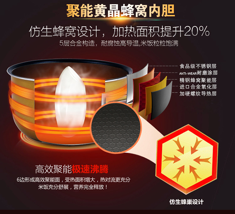 电饭煲可以同时满足1-6人饭量,升级聚能金釜,升温迅速,有效防止热量流失,热量直达米芯,让每一粒饭都受热均匀,环形均匀加热更是让你和夹生米饭说BYEBYE!